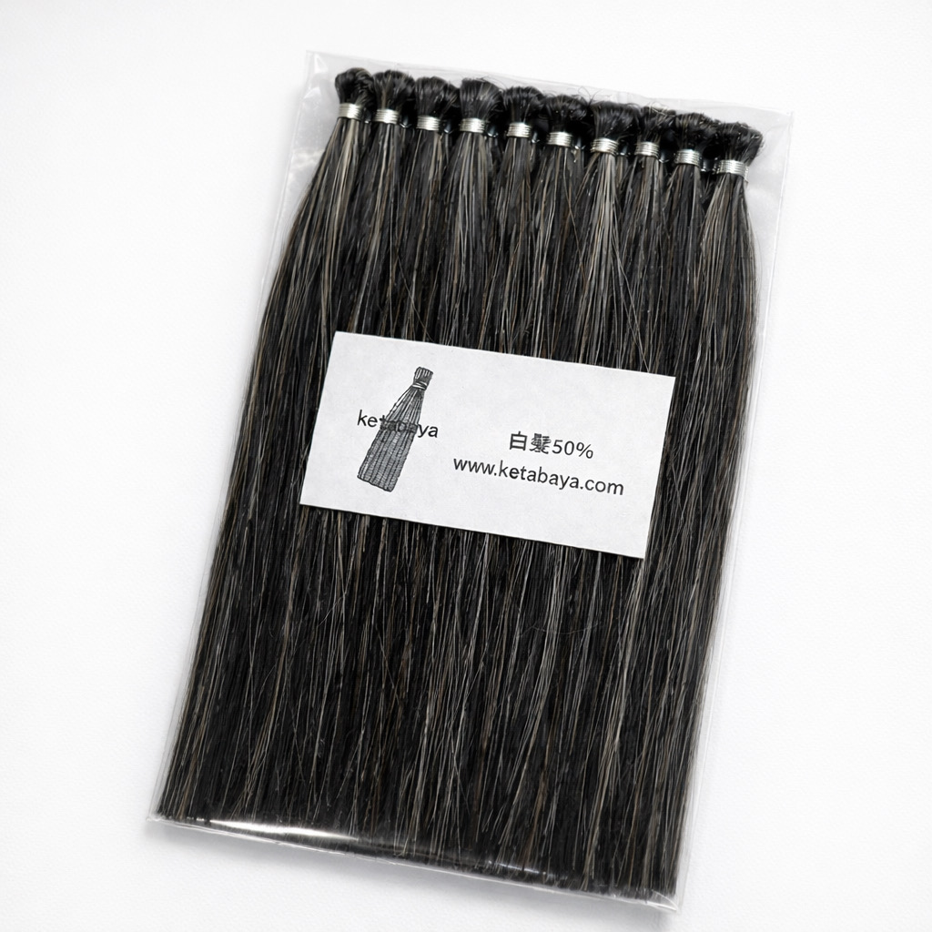 特定個人の髪を束ねたものではないため、白髪の状態には個体差があります。