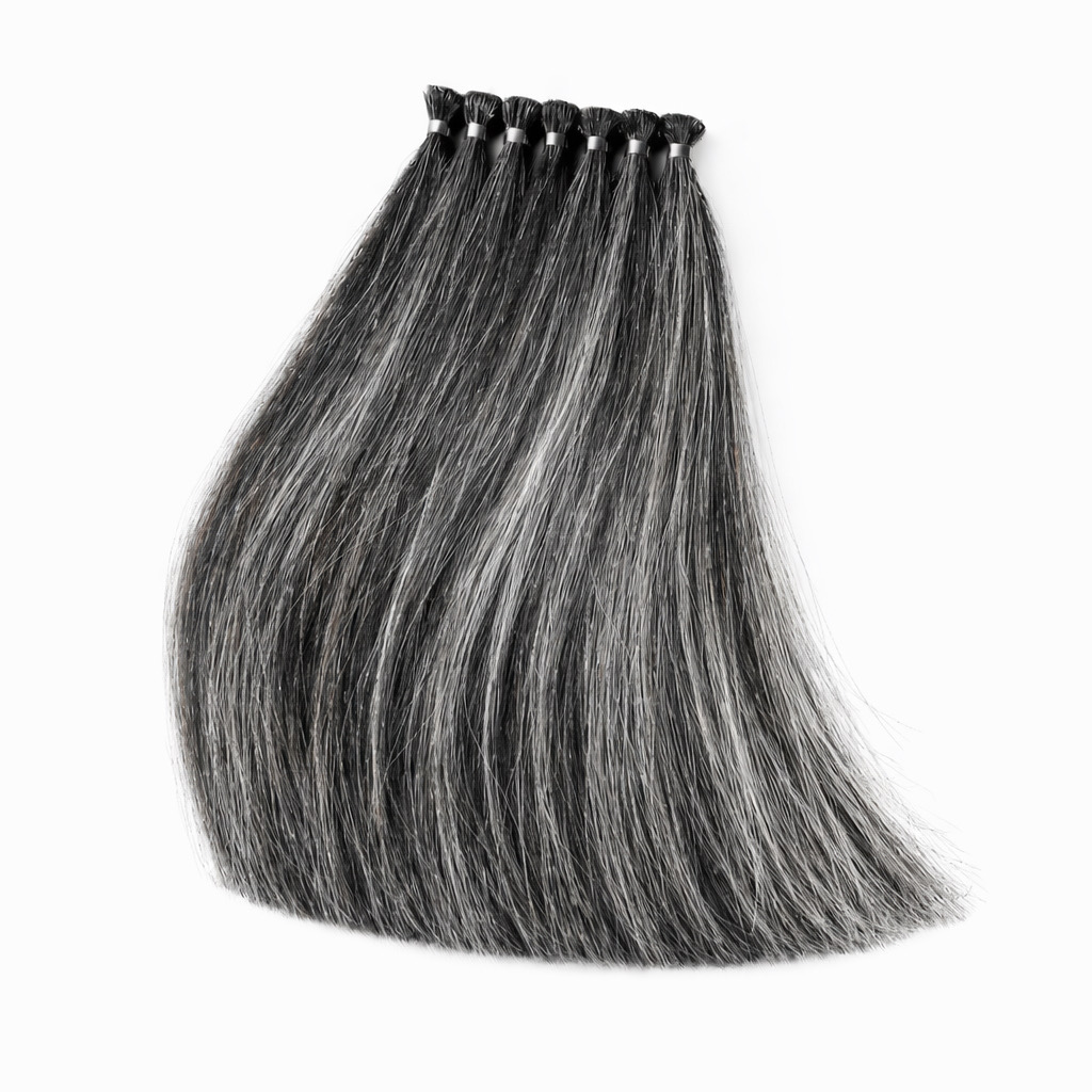黒髪と白髪が混在した人毛毛束を使用することで、白髪染めやグレイカラー剤の
