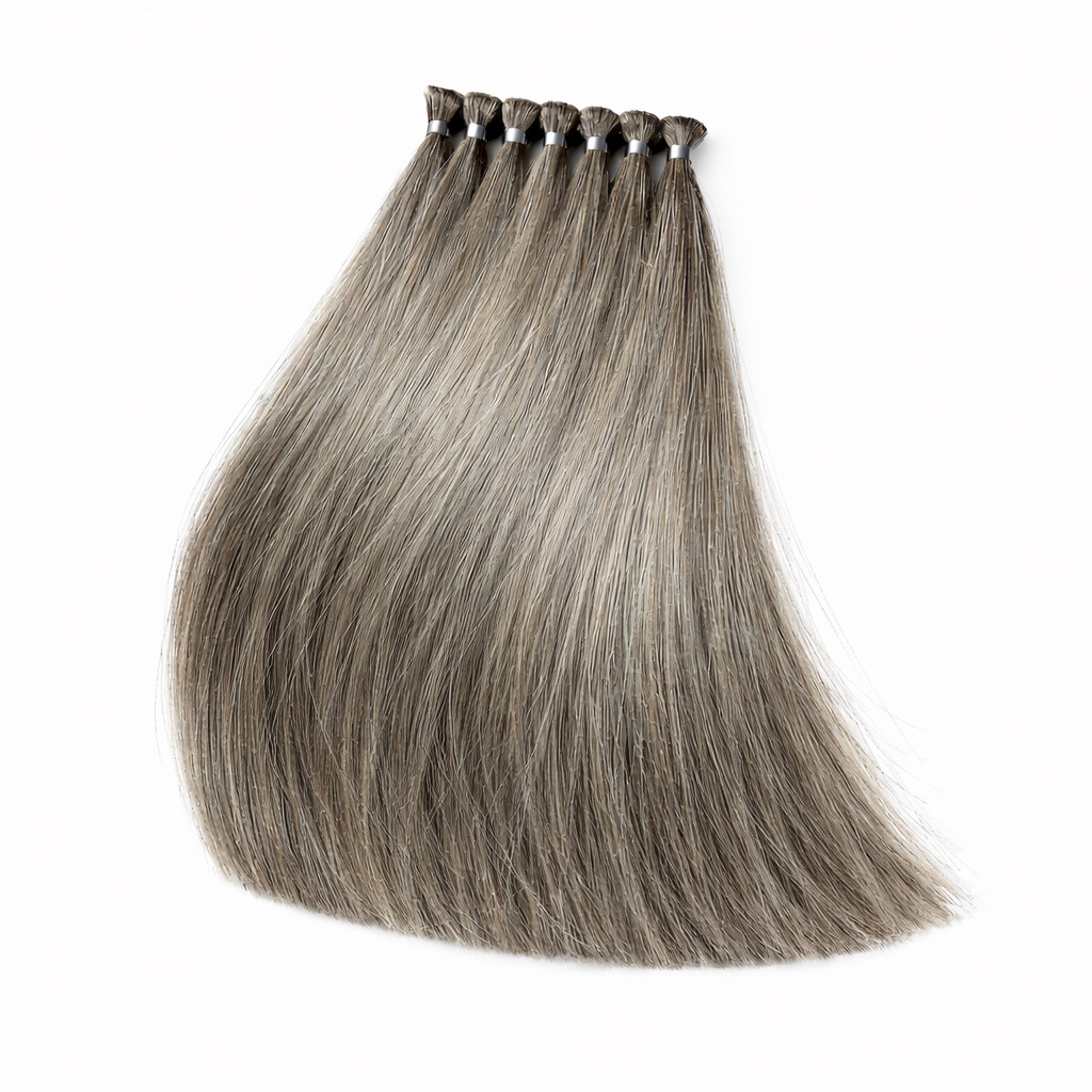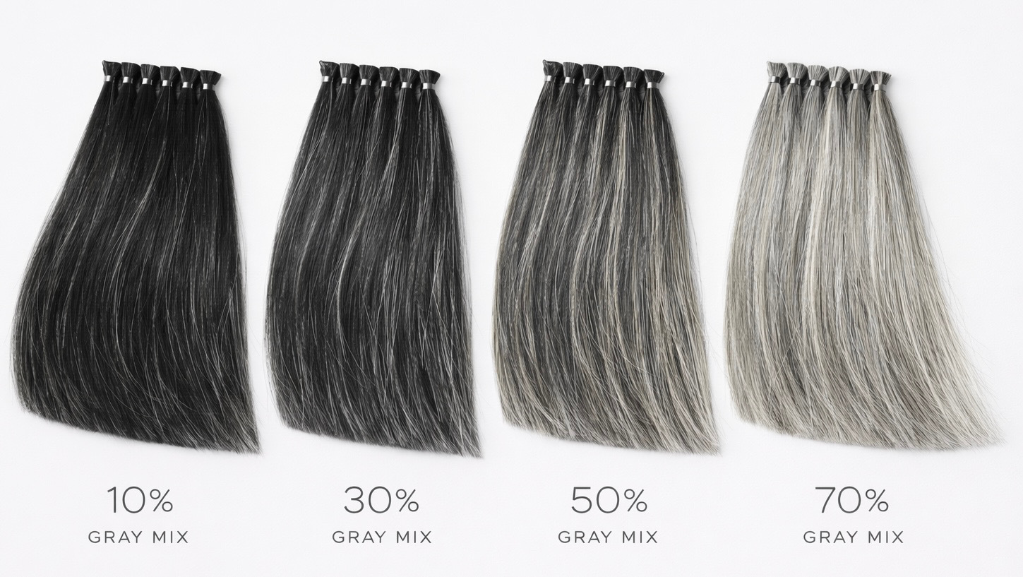 黒髪と白髪が混在した人毛毛束を使用することで、白髪染めやグレイカラー剤の